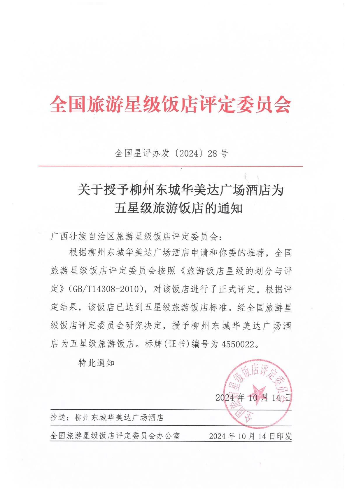 10月14日,經(jīng)全國旅游飯店星級評定委員會研究決定,正式授予柳州東城華美達廣場酒店為...